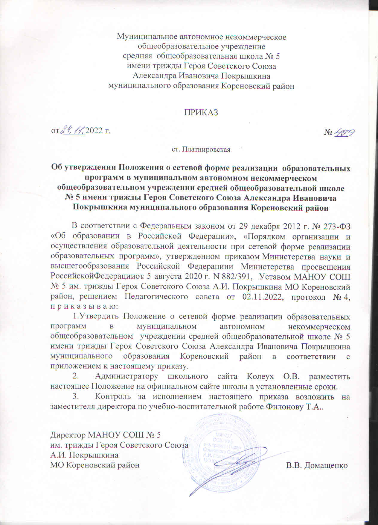 Приказ "Об утверждении Положения о сетевой форме реализации образовательных программ в МАНОУ СОШ № 5 имени трижды Героя Советского Союза А.И.Покрышкина скачать