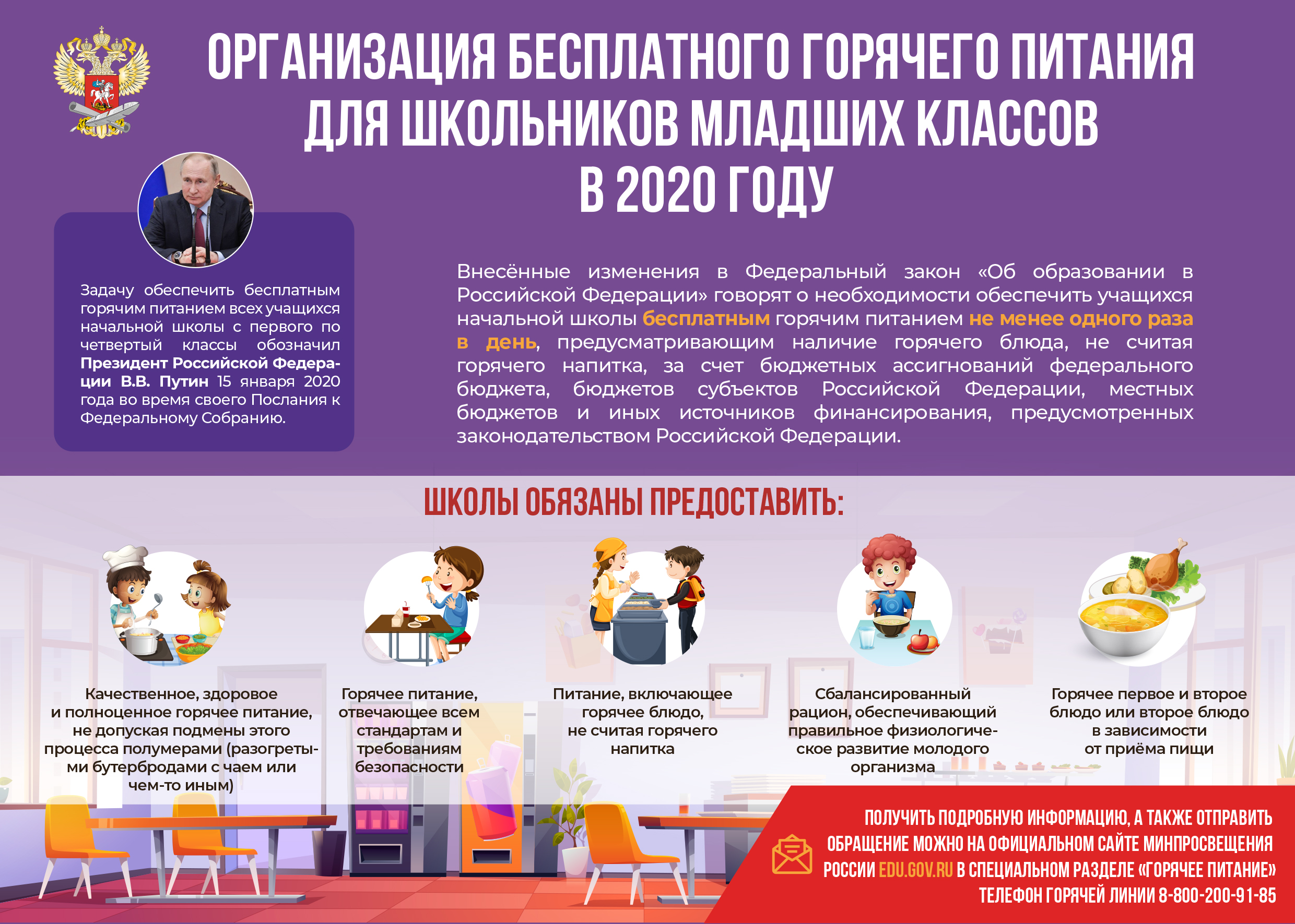 В рамках выполнения поручений по реализации Послания Президента Российской Федерации в МОБУ СОШ №5 имени трижды Героя Советского Союза А. И. Покрышкина МО Кореновский район с начала 2020-2021 учебного года введено бесплатное одноразовое горячее питание обучающихся 1-4 классов.