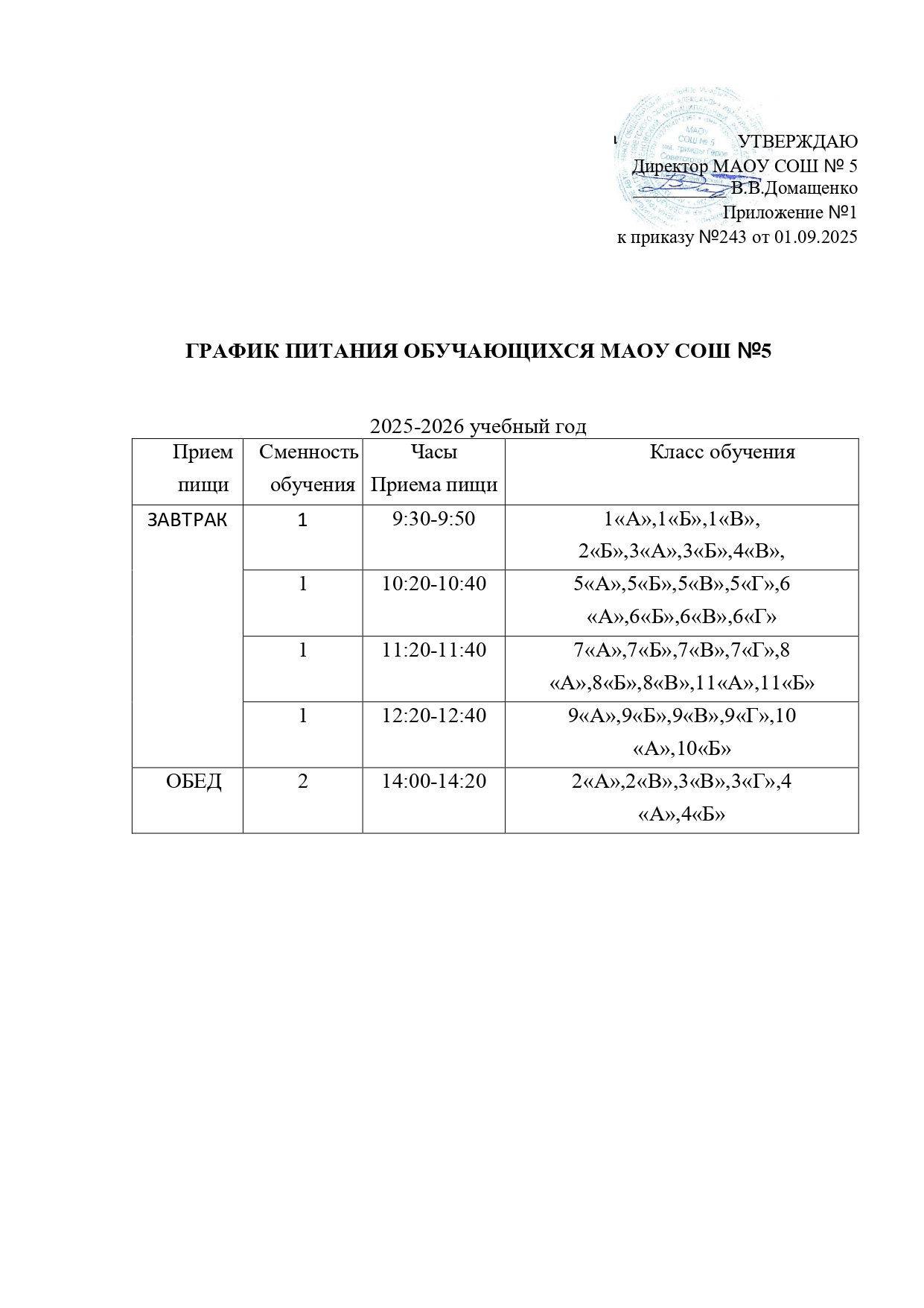 Приказ об организации питания учащихся в 2025-2026 учебном году в МАОУ СОШ № 5 им. трижды Героя Советского Союза А.И.Покрышкина МО Кореновский район скачать